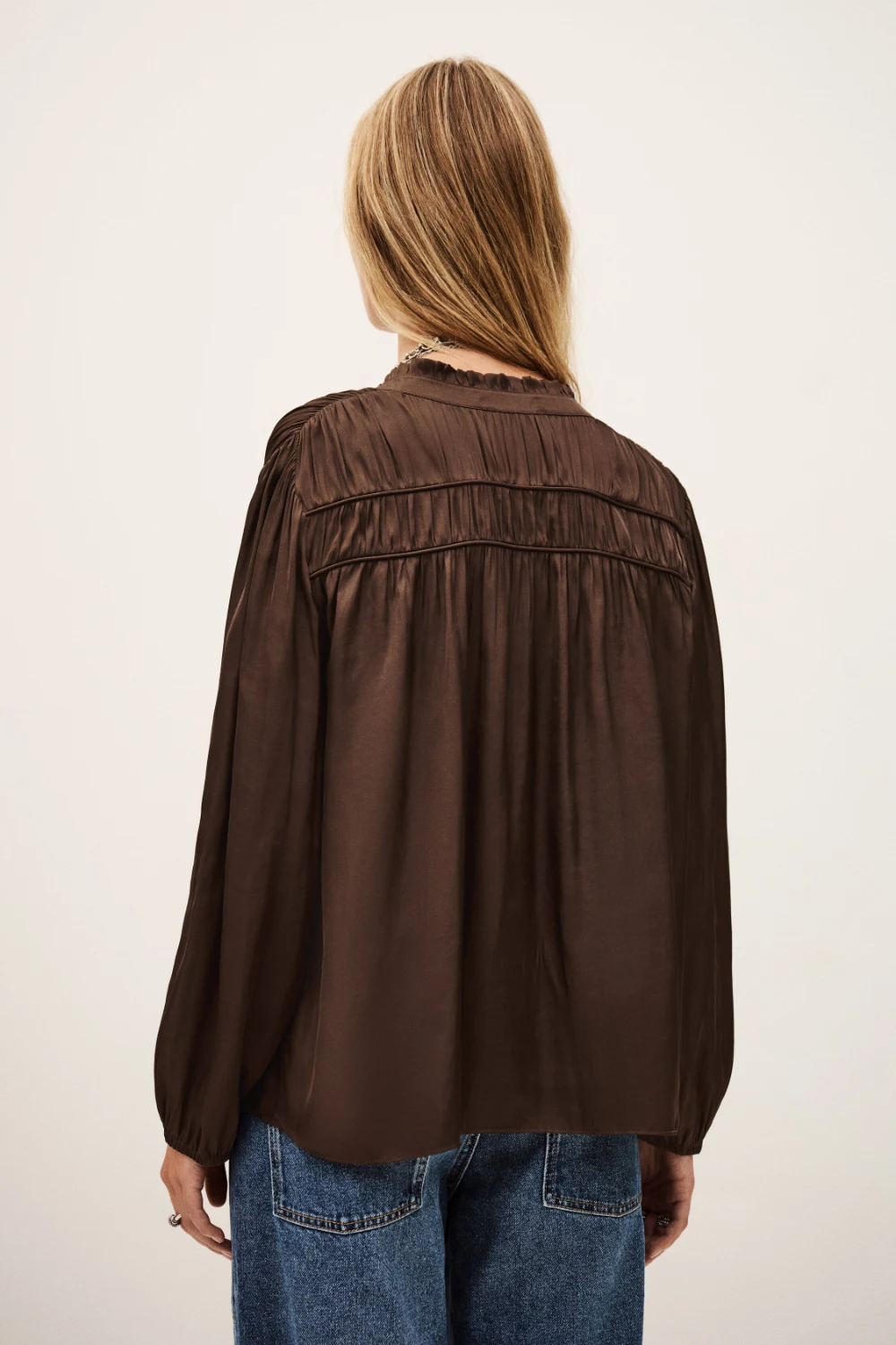 Wide-cut blouse featuring a V-neckline, button fastening, and fitted cuffs. Designed with a delicate ruffled collar and inlaid bias details for an elegant, refined look. This model is made with recycled synthetic fibres.