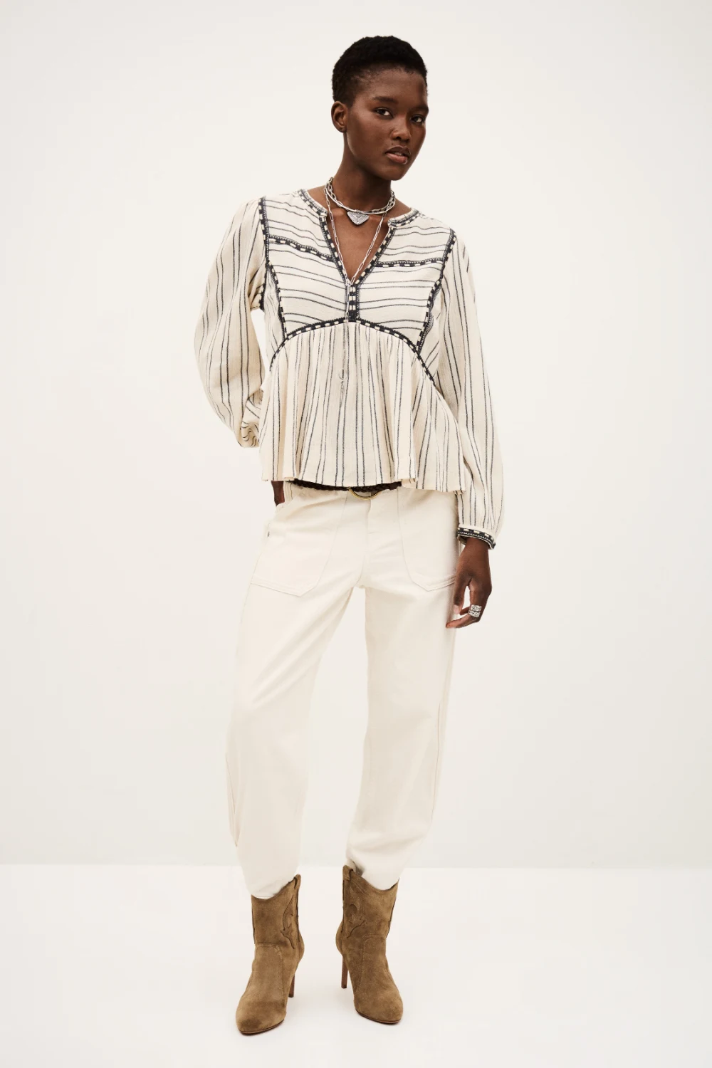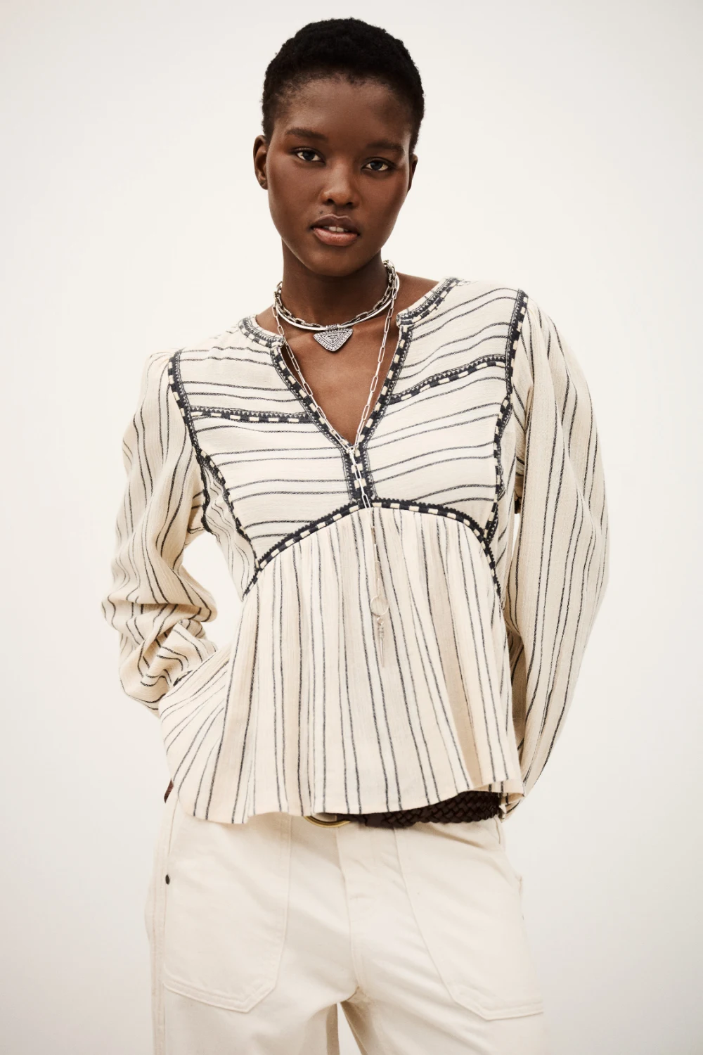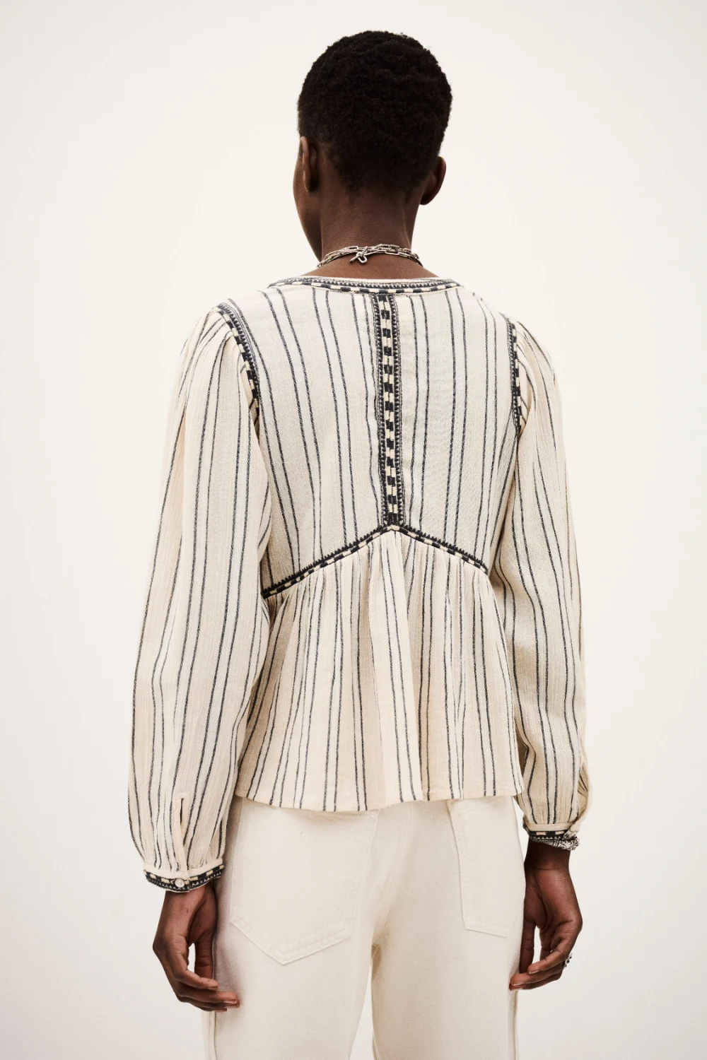 Blouse with long puff sleeves and a V-neckline, featuring delicate trim details and soft gathers for a refined, feminine look.