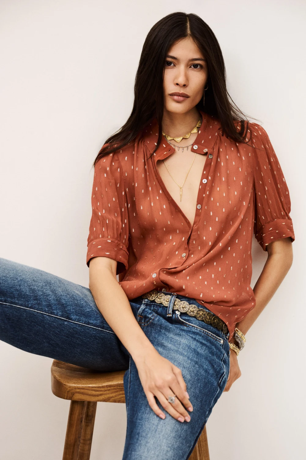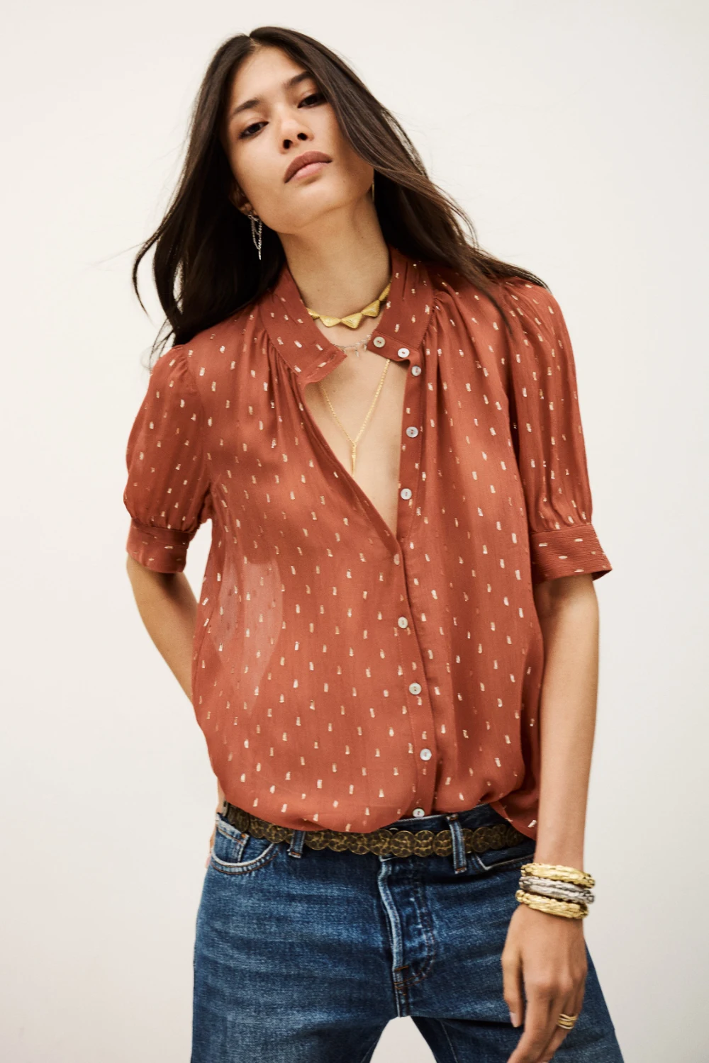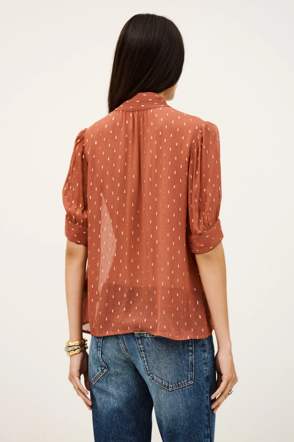 A loose-fit blouse with a straight cut, high neckline, and buttoned fastening. Designed with short sleeves and crafted from delicate dotted Swiss fabric for a light, feminine touch. The viscose in this model is made from wood pulp sourced from sustainably managed forests.