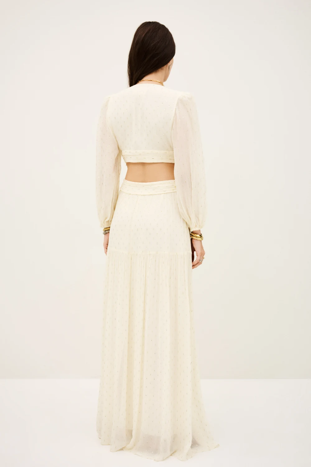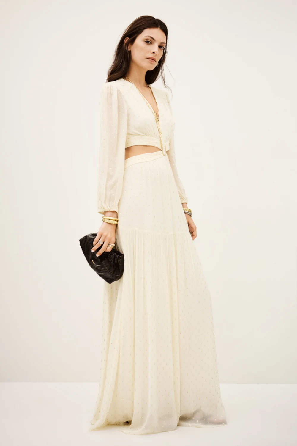 A flowing dress with three-quarter sleeves, elasticated cuffs, and a V-neckline. Features graphic cut-outs at the waist, draped and pleated details, and a cutaway back. Fully lined with subtle lurex accents for a touch of shimmer. The viscose in this model is made from wood pulp sourced from sustainably managed forests.