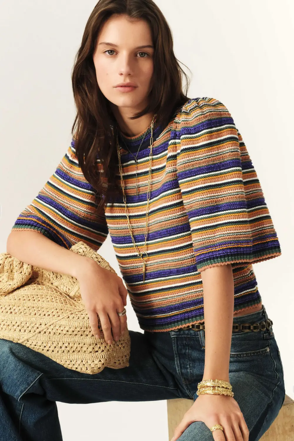 טופ עם מפתח עגול, כיווצים בכתפיים, שרוולים רחבים, פרטים מחוררים וגזרה מרווחת ונינוחה