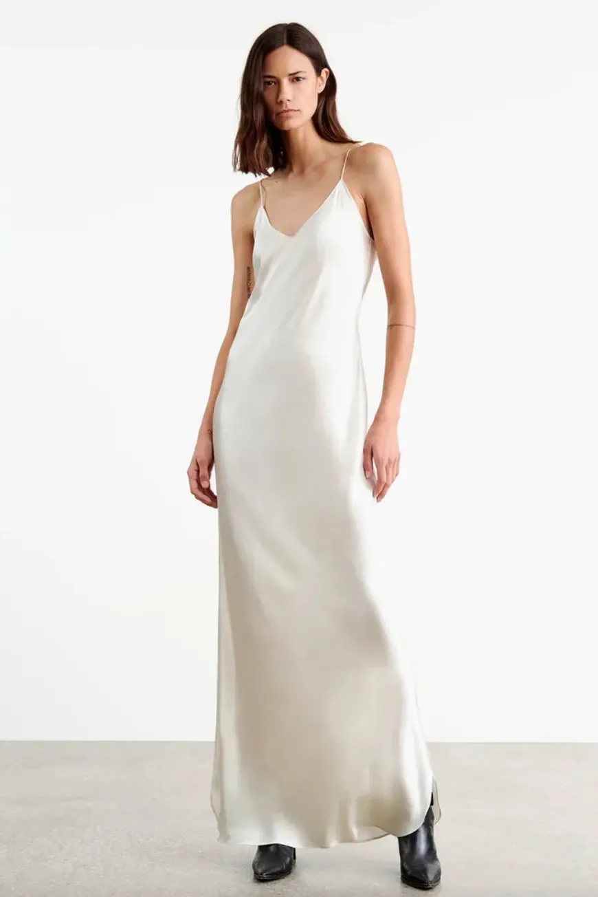 Bias cut floor length gown in silk charmeuse. Adjustable skinny straps. Shirt tale detail at hem.