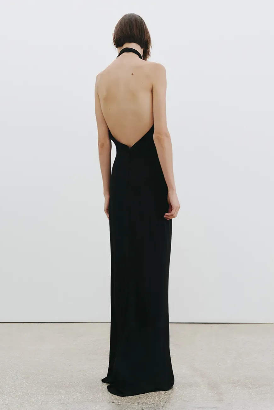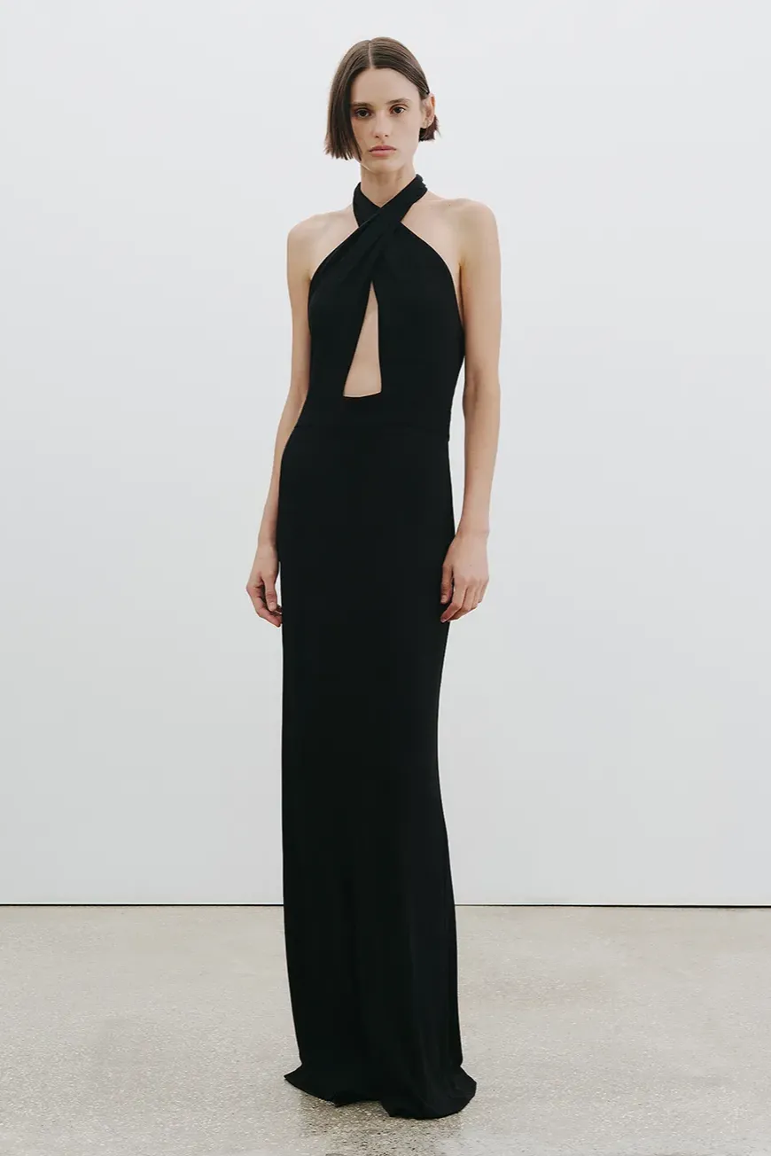 Pullover gown in matte jersey. Halter neck. Keyhole detail. Crossover front detail with waist accent. Back zipper closure.