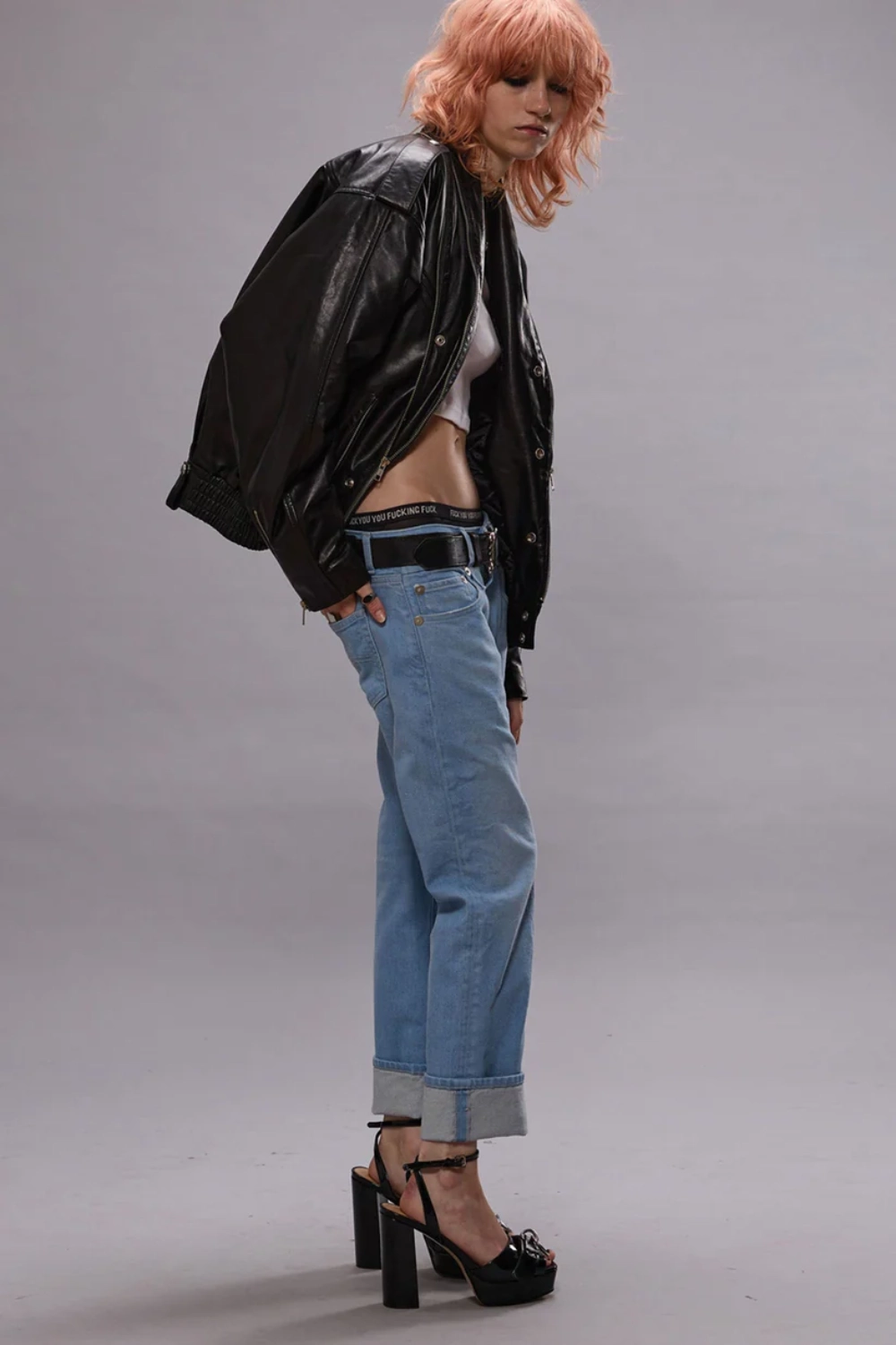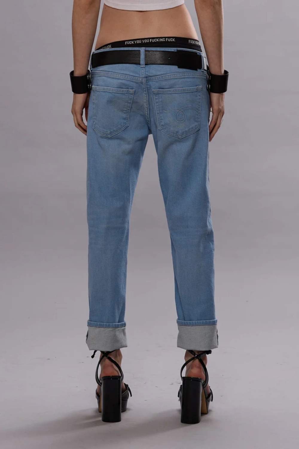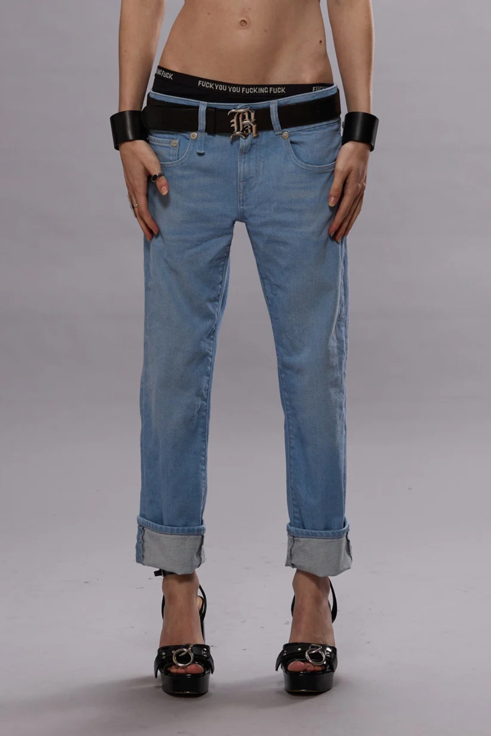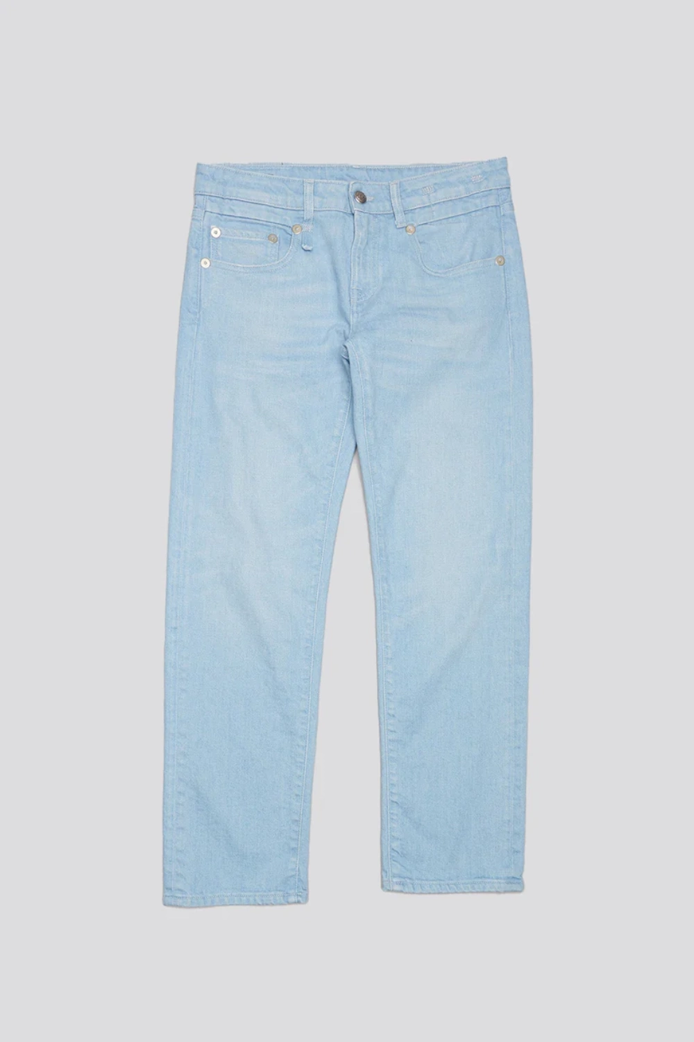 דגם Boy Straight האיקוני של R13 בגזרה נמוכה וישרה-צמודה באורך קרופ, עשוי דנים יפני אקרו עם גמישות נוחה
