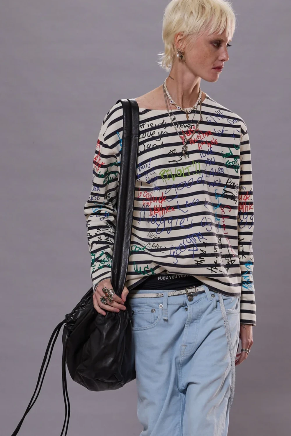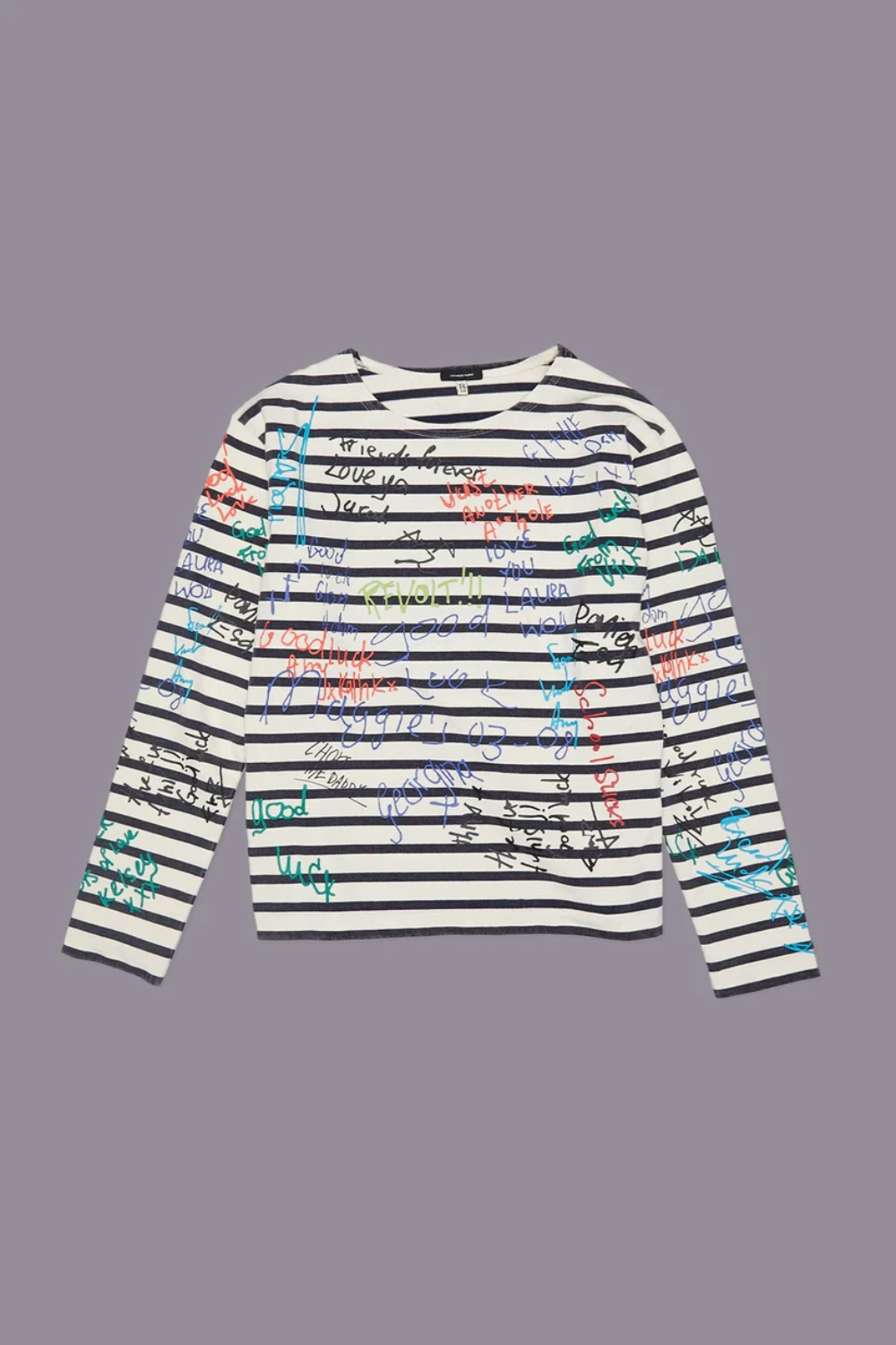 טי שירט פסים ארוכה עם הדפס גרפי מלא לכל האורך