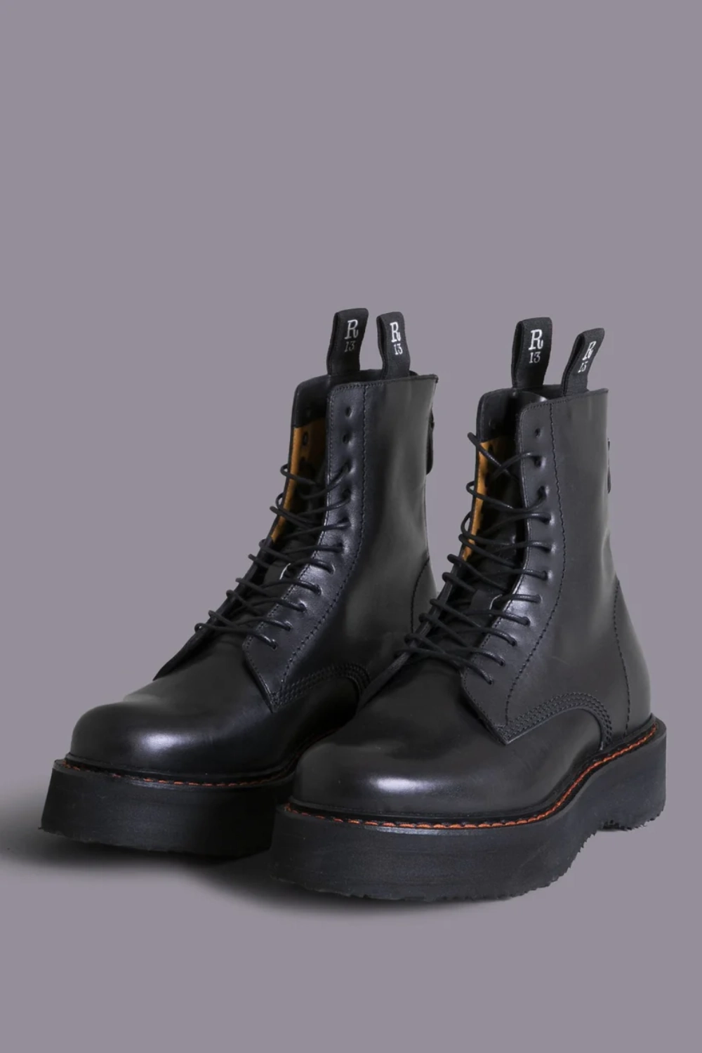 מגף צבאי קלאסי בעבודת יד מבית R13, עם לולאות משיכה ממותגות וסוליה גבוהה רב-שכבתית, עשוי עור איטלקי פרימיום.